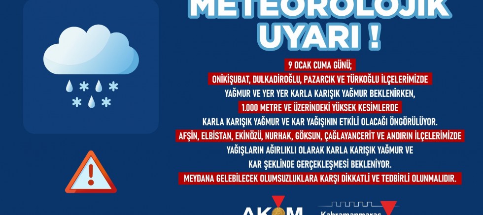 Kahramanmaraş Büyükşehir Belediyesi Afet Koordinasyon Merkezi, 9 Ocak Cuma günü şehir genelinde yağmur ve kar yağışının etkili olacağını duyurdu. Dikkatli ve tedbirli olunması noktasında vatandaşlar uyarılırken, kış şartlarıyla mücadele kapsamında ekiplerin hazır olduğu belirtildi.