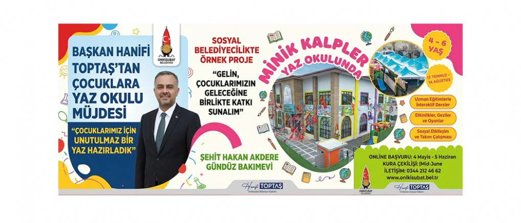 Onikişubat Belediye Başkanı Hanifi Toptaş, çocuklara yönelik sosyal belediyecilik projeleriyle dikkat çekmeye devam ediyor. Göreve geldiği günden bu yana vatandaş odaklı hizmet anlayışıyla öne çıkan Toptaş, bu kez de miniklere unutulmaz bir yaz tatili sunacak “Minik Kalpler Yaz Okulu” projesini duyurdu.