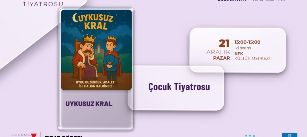 Kahramanmaraş Büyükşehir Belediyesi, 21 Aralık Pazar günü “Uykusuz Kral” adlı tiyatro oyununu NFK Kültür Merkezi’nde çocuklarla buluşturacak. Ücretsiz olarak sahnelenecek gösteriye tüm çocuklar davet edildi.
