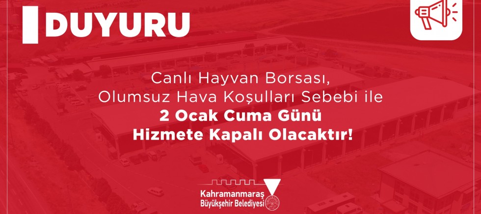 Kahramanmaraş Büyükşehir Belediyesi, olumsuz hava koşulları nedeniyle Canlı Hayvan Borsası’nın 2 Ocak Cuma günü hizmete kapalı olacağını duyurdu.