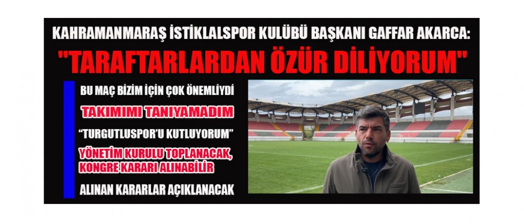 Akedaş Kahramanmaraş İstiklalspor, deplasmanda Turgutluspor’a karşı 1-0 mağlup olarak Play-off yolunda büyük bir yara aldı. Kulüp Başkanı Gaffar Akarca, takımın kötü performansından dolayı taraftarlardan özür dilerken, yönetim kurulu olarak bu mağlubiyetin hesabını soracaklarını ve gerekirse kongre kararı alacaklarını belirtti.
