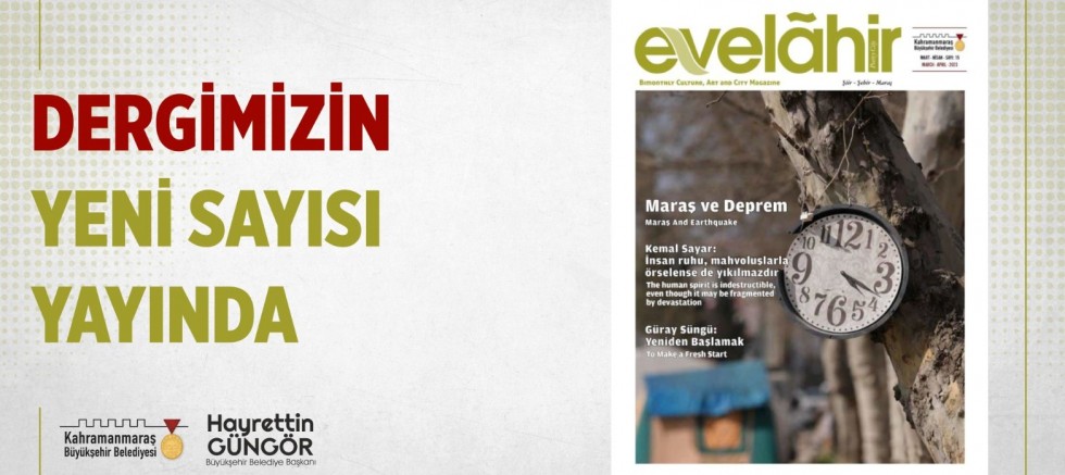 Şehrin yeniden imar ve inşası için tüm alanlarda faaliyetlerini kesintisiz sürdüren Kahramanmaraş Büyükşehir Belediyesi, hayatın normalleşmesi için de yoğun gayret gösteriyor. Şehrin kültür envanterini zenginleştirmek, edebi ve sanatsal birikimini artırmak ve kültür sanat etkinliklerine derinlik kazandırmak için çalışmalarını sürdüren Büyükşehir Belediyesi, Kültür Yayınları’ndan Evelahir’in yeni sayısını okurlarla buluşturdu. Şehrin kültür sanat dergisi olan Evelahir’in yeni sayısında; asrın felaketi, Kahramanmaraş’ın tarihinde meydana gelen depremler, 6 Şubat depremlerinin tarihi dokuya verdiği zarar, şehrin ihya ve inşası gibi pek çok konu farklı perspektiften ele alınıyor. Evelâhir Dergisi’nin yeni sayısına ve Kültür Yayınları’na ait diğer eserlere https://kahramanmaras.bel.tr/e-dergi ve https://www.marastaedebiyat.com internet adresleri üzerinden e-dergi formatında ulaşılabiliyor.