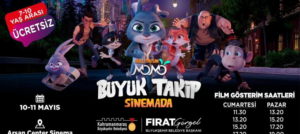 Kahramanmaraş Büyükşehir Belediyesi, TRT’nin sevilen yapımlarından biri olan “Akıllı Tavşan Momo: Büyük Takip” adlı animasyon filmini 10 ve 11 Mayıs tarihlerinde Arsan Center Sinema’da ücretsiz olarak minik izleyicilerle buluşturacak.