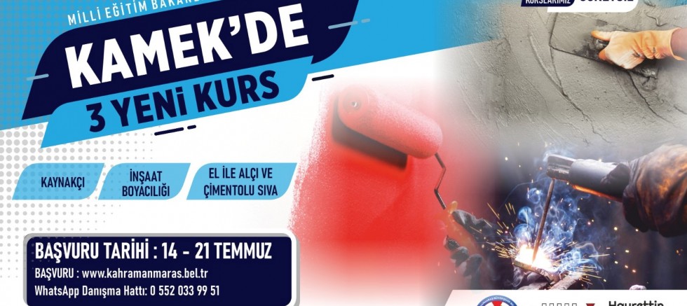 Kahramanmaraş Büyükşehir Belediyesi’nin Meslek Edindirme ve Sanat Eğitimi Kursları’nda (KAMEK) deprem sonrası yeni dönem eğitimleri sürüyor. 28 farklı branşta düzenlenen eğitimlere 3 yeni kurs daha ekleniyor. Kaynakçı, İnşaat Boyacılığı ve El ile Alçı ve Çimentolu Sıva kurslarına kayıtlar başladı. Büyükşehir Belediyesi’nin internet adresinden (https://kahramanmaras.bel.tr/duyuru/2023/07/14/kamek-kaynakci-insaat-boyaciligi-ve-el-ile-alci-ve-cimentolu-siva-kursu-basvuru-formu) çevrimiçi yapılabilen başvurularda son gün 21 Temmuz Cuma. 18 yaş ve üzeri vatandaşların başvuru yapabileceği kursları başarıyla tamamlayan kursiyerler, Milli Eğitim Bakanlığı onaylı katılım sertifikası almaya hak kazanacak. Büyükşehir Belediyesi’nden yapılan açıklamada, kurslara ve başvurulara ilişkin detaylı bilgiye 0552 033 99 51 numaralı WhatsApp danışma hattından ulaşılabileceği belirtildi.
