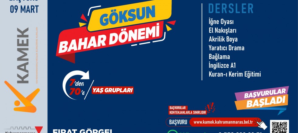 Göksun’da düzenlenecek KAMEK kurslarına katılmak isteyen vatandaşlar başvurularını çevrimiçi olarak gerçekleştirebilecek. Kayıt yaptırmak isteyenler, https://kahramanmaras.bel.tr/duyuru/2026/03/09/goksun-kamek-kurslari-basvuru-formu adresi üzerinden başvuru formuna ulaşarak işlemlerini tamamlayabiliyor.