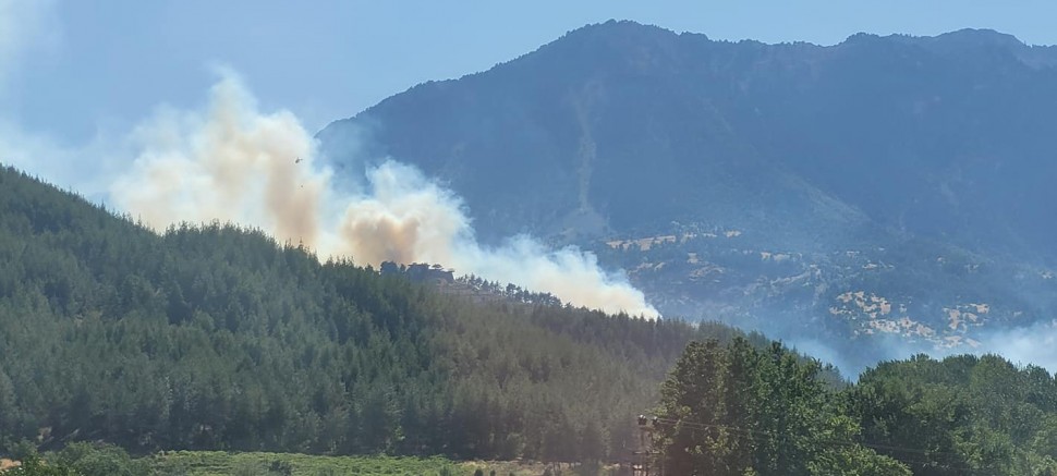 Ekiplerin alevleri kontrol altına almak için çalışması devam ederken, bir helikopter söndürme çalışmalarına havadan destek veriyor.