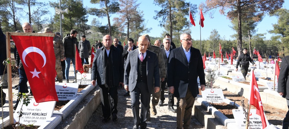 66. Hükümet Tarım ve Orman Bakanı Prof. Dr. Vahit Kirişci ile Kapıçam Mezarlığını ziyaret eden Başkan Güngör, “6 Şubat depremlerinde kaybettiğimiz tüm canlarımızı rahmetle anıyoruz” dedi.