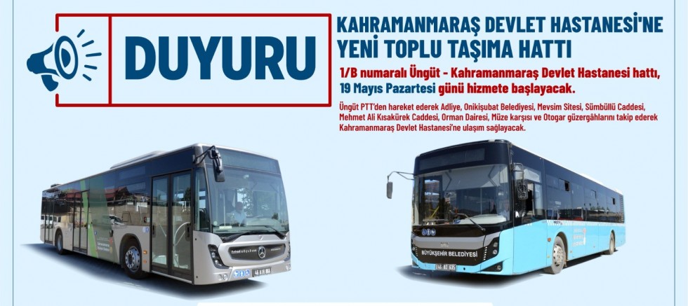 Kahramanmaraş Büyükşehir Belediyesi, Onikişubat Üngüt Mahallesi’nden Kahramanmaraş Devlet Hastanesi’ne ulaşım sağlayacak yeni toplu taşıma hattının 19 Mayıs Pazartesi günü hizmete başlayacağını duyurdu.