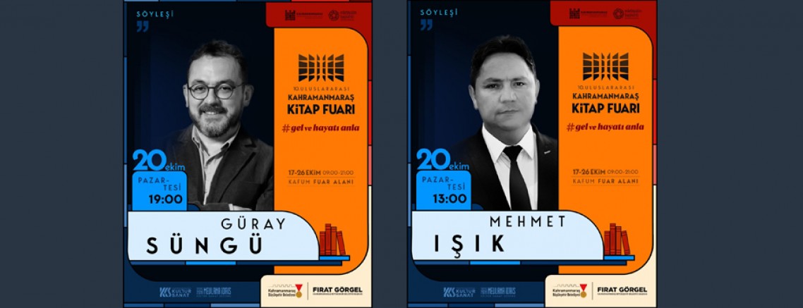 10. Uluslararası Kahramanmaraş Kitap Fuarı’nda 20 Ekim Pazartesi günü; Tarihçi ve Yazar Mehmet Işık ve Türk öykü ve roman yazarı Güray Sürgü, fuarda kitapseverlerle bir araya gelerek söyleşi gerçekleştirecek.