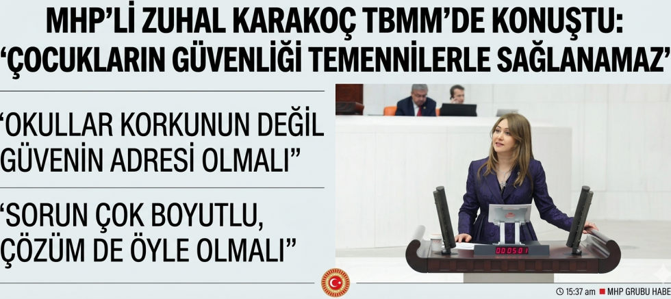 Milliyetçi Hareket Partisi (MHP) Kahramanmaraş Milletvekili Zuhal Karakoç, Türkiye Büyük Millet Meclisi Genel Kurulu’nda yaptığı konuşmada, Kahramanmaraş ve Şanlıurfa’da yaşanan okul saldırılarına dikkat çekerek çocukların güvenliği ve dijital tehditler konusunda önemli mesajlar verdi.